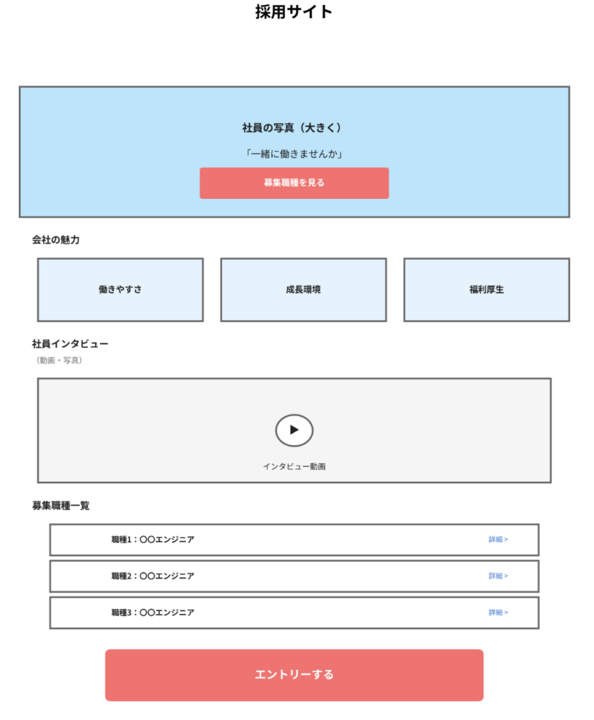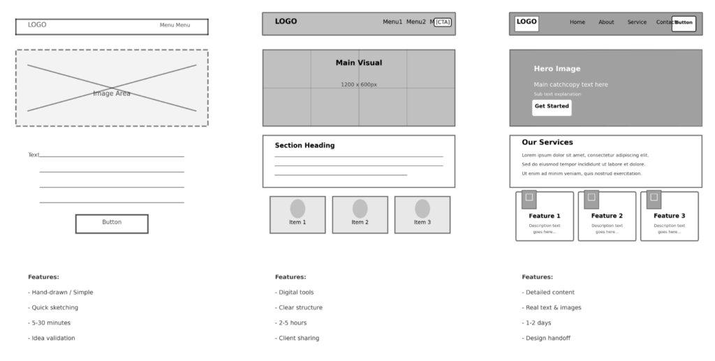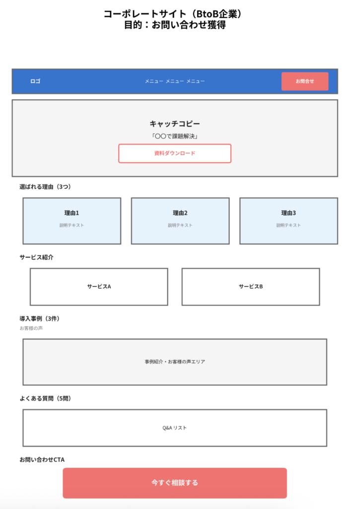 Webサイトも同じです。ワイヤーフレームで「メニューはここ」「メイン画像はこの位置」「お問い合わせボタンはここ」と決めてから、デザインやコーディングに進みます。