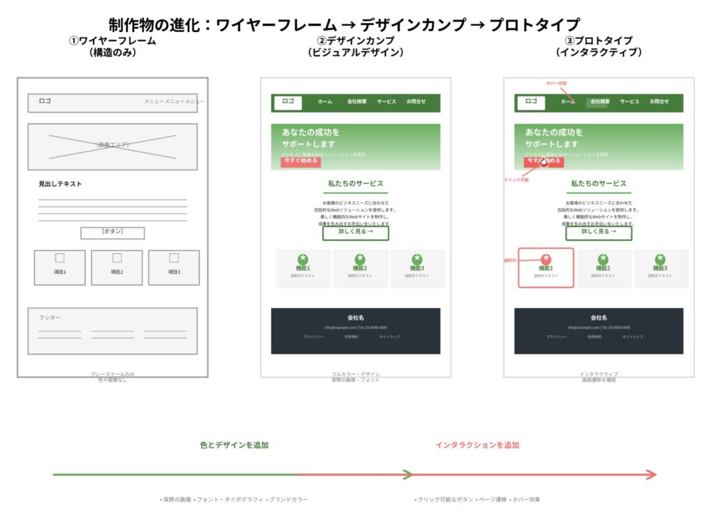 | 項目 | ワイヤーフレーム | デザインカンプ | モックアップ | プロトタイプ |