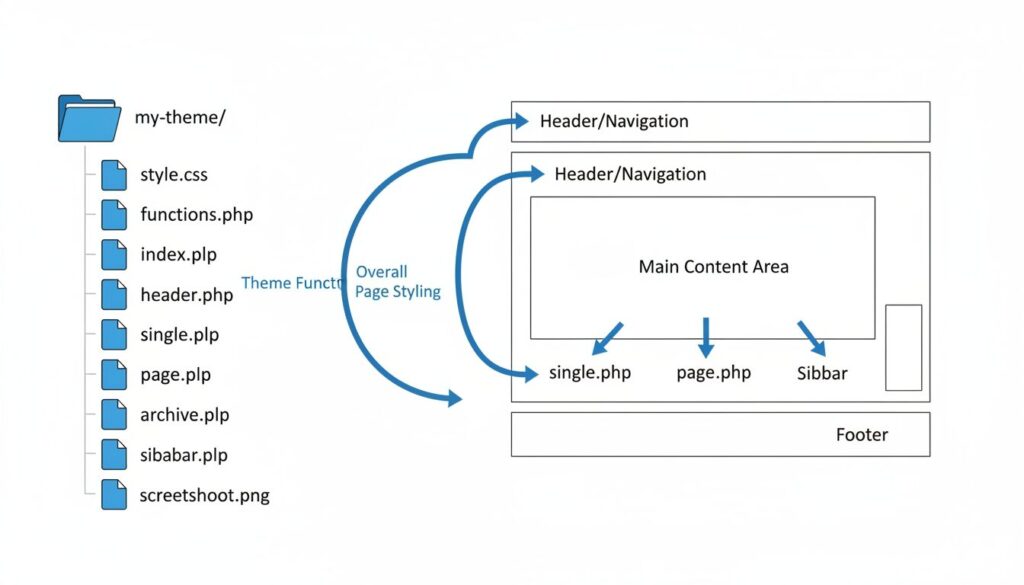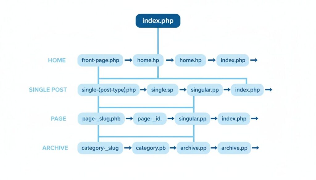 WordPressテンプレート階層の理解が効率的なテーマ開発の鍵になります。WordPressは、表示しようとしているページの種類(トップページ、投稿ページ、固定ページ、カテゴリーページなど)に応じて、読み込むテンプレートファイルを自動的に決定します。例えば、個別投稿ページでは single-{post_type}.phpsingle.phpsingular.phpindex.php の順に探索され、最初に見つかったファイルが使われます。