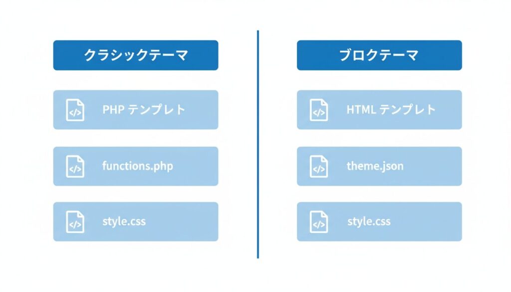 クラシックテーマ(本記事で解説してきた従来型テーマ)はPHPテンプレートとfunctions.phpを中心に構成されます。一方、ブロックテーマはHTMLテンプレートとtheme.jsonを中心に構成され、テンプレート内のレイアウトはWordPressのブロックマークアップで記述します。