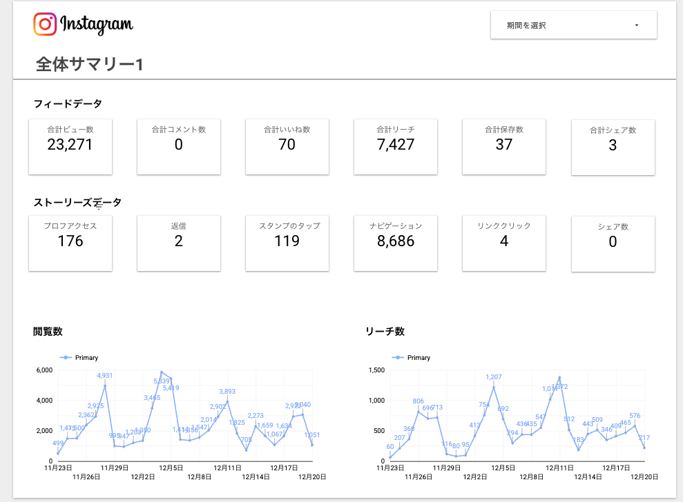 フィード投稿とストーリーズのパフォーマンスを一括で確認できます。