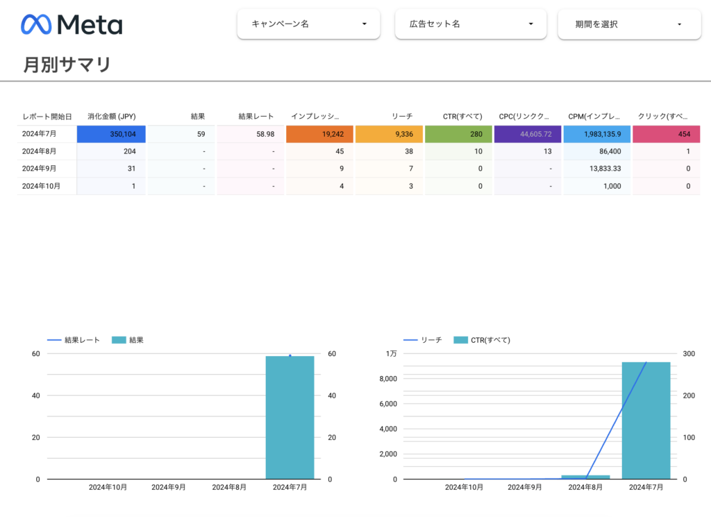 分析ポイント: この極端な差は、7月に効果的だった要素(クリエイティブ、ターゲティング、オファーなど)が8月以降失われた可能性を示しています。