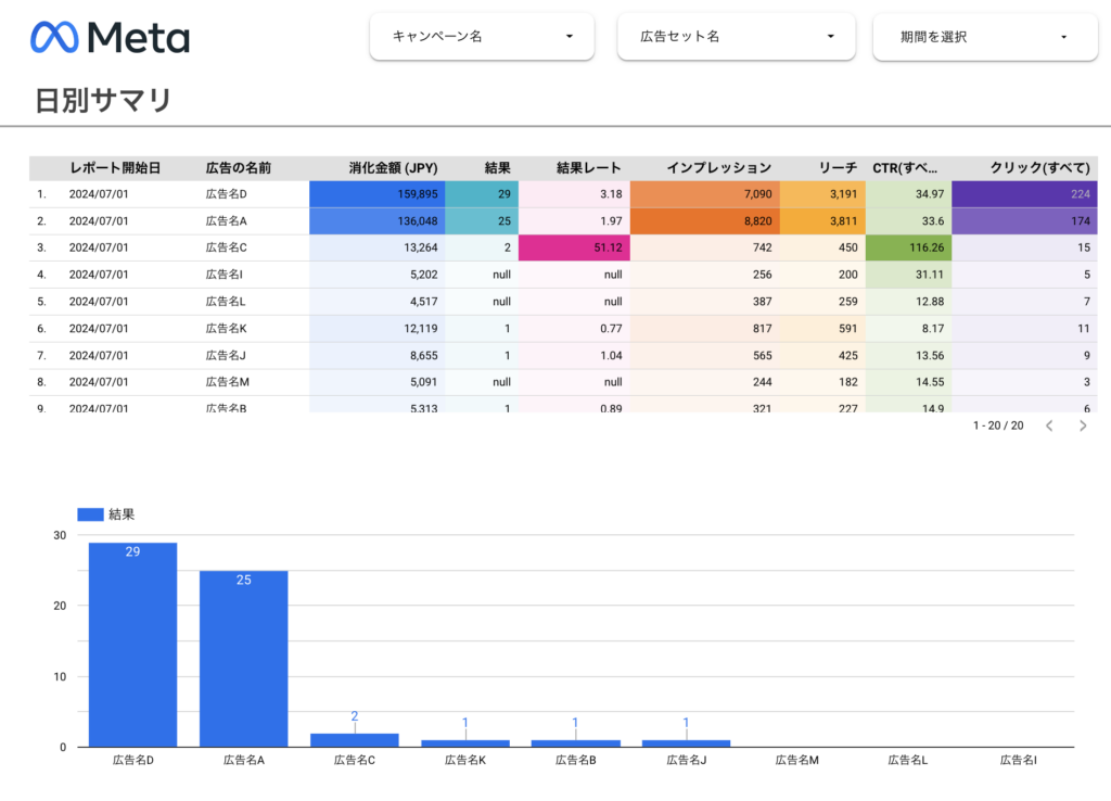 - CPA、ROAS、コンバージョン数などKPIを自動集計できる