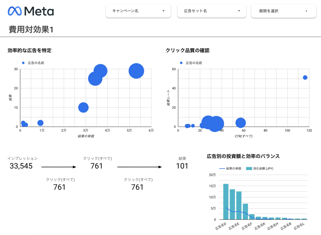 広告別投資額チャート: 広告名DとEが大きな予算を使用しているものの、CPAのバランスを確認できます。