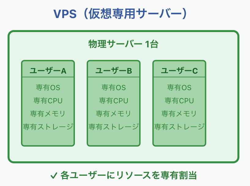 VPSは「仮想専用サーバー」と訳され、1台の物理サーバーを仮想化技術により複数の仮想サーバーに分割し、各ユーザーに専有スペースを提供するサービスです。各仮想サーバーには独自のCPU、メモリ、ディスク容量が割り当てられます。
