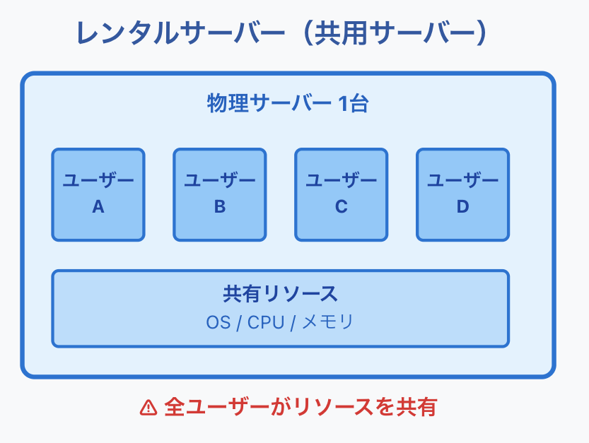 レンタルサーバー(共用サーバー)は、1台の物理サーバーを複数のユーザーで共有して利用するホスティングサービスです。サーバーのOS、データベースシステム、Webサーバーソフトウェアなどがあらかじめインストールされた状態で提供されます。